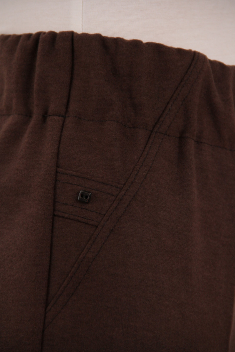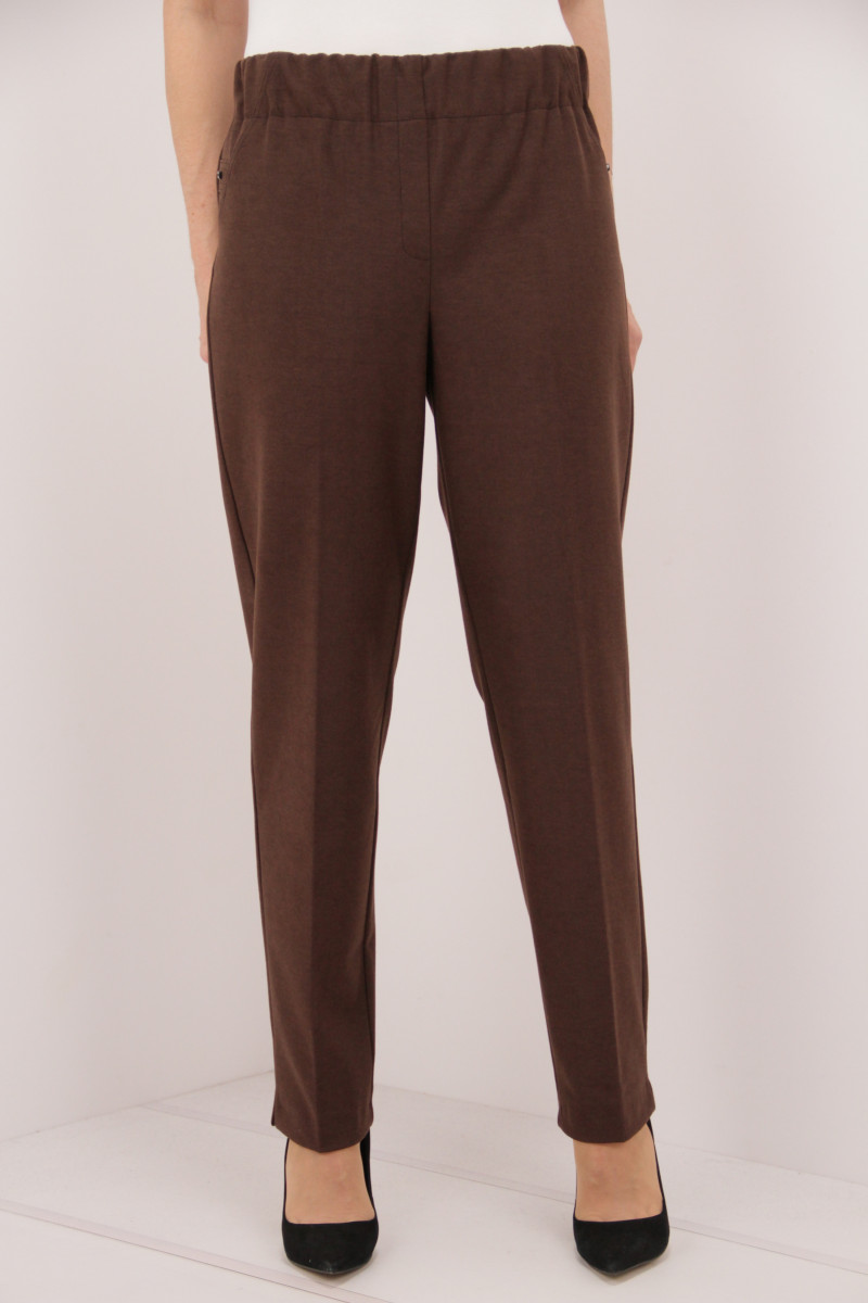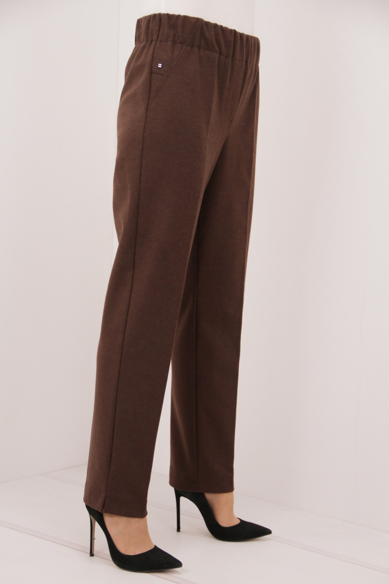 На моделі 50 розмір. Рекомендовані ростовки: 50-58 розміри ( 5 од.) та 48-58 розміри ( 6 од.). Розміри українські. Cклад: 35% Бавовна, 50% Поліестер, 5% Спандекс, 5% Еластан, 5% Лайкра. Тканина: Стретч-кашемір. Колір : коричневий.