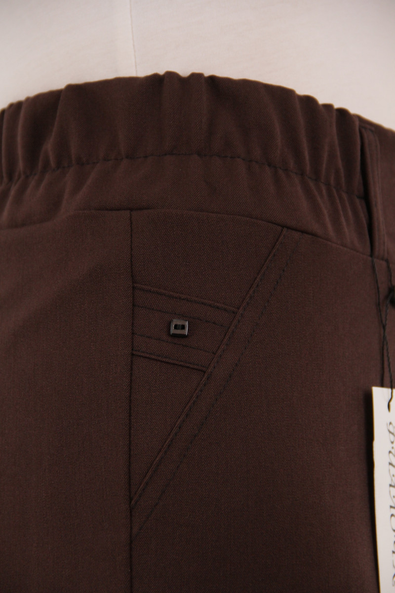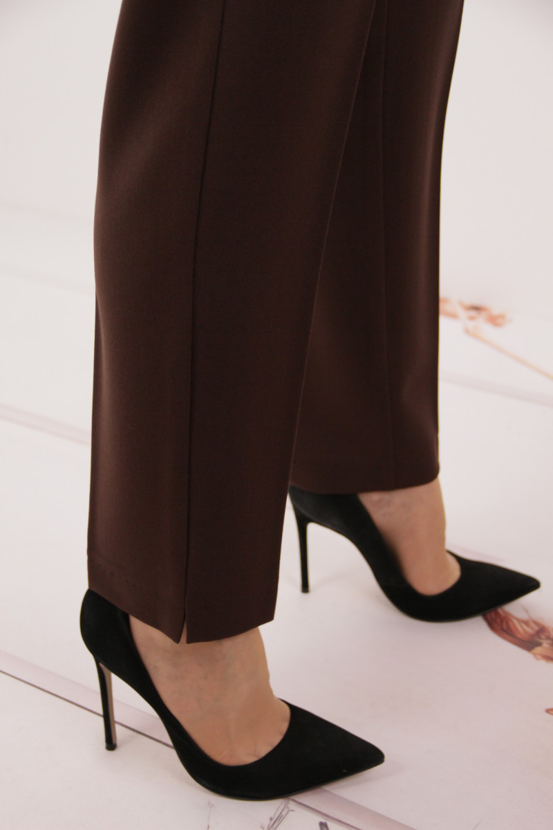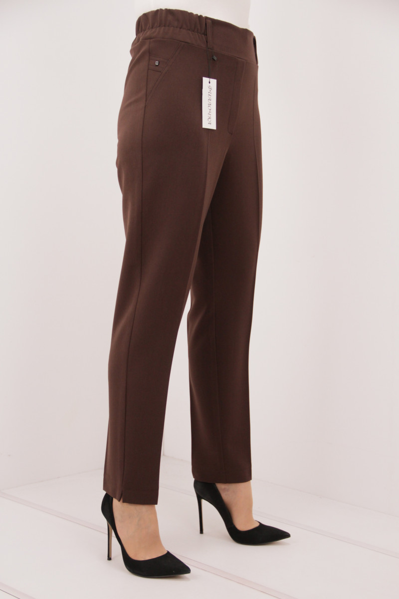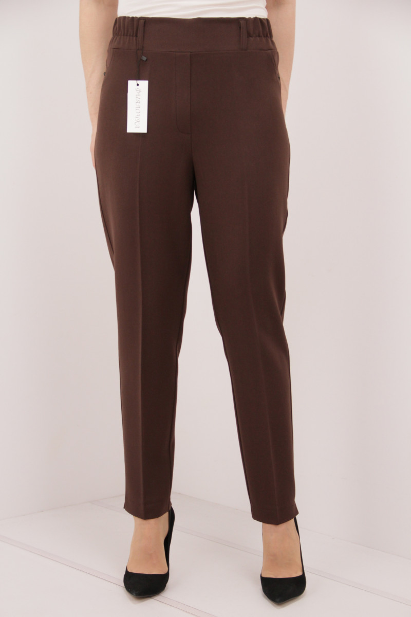 На моделі 50 розмір. Рекомендовані ростовки: 50-56 розміри ( 4 од.) та 48-56 розміри ( 5 од.). Розміри українські. Cклад: 45% Полівіскоза, 36% Бавовна, 14% Спандекс, 5% Лайкра. Тканина: Вероніка (костюмка). Колір: шоколад.