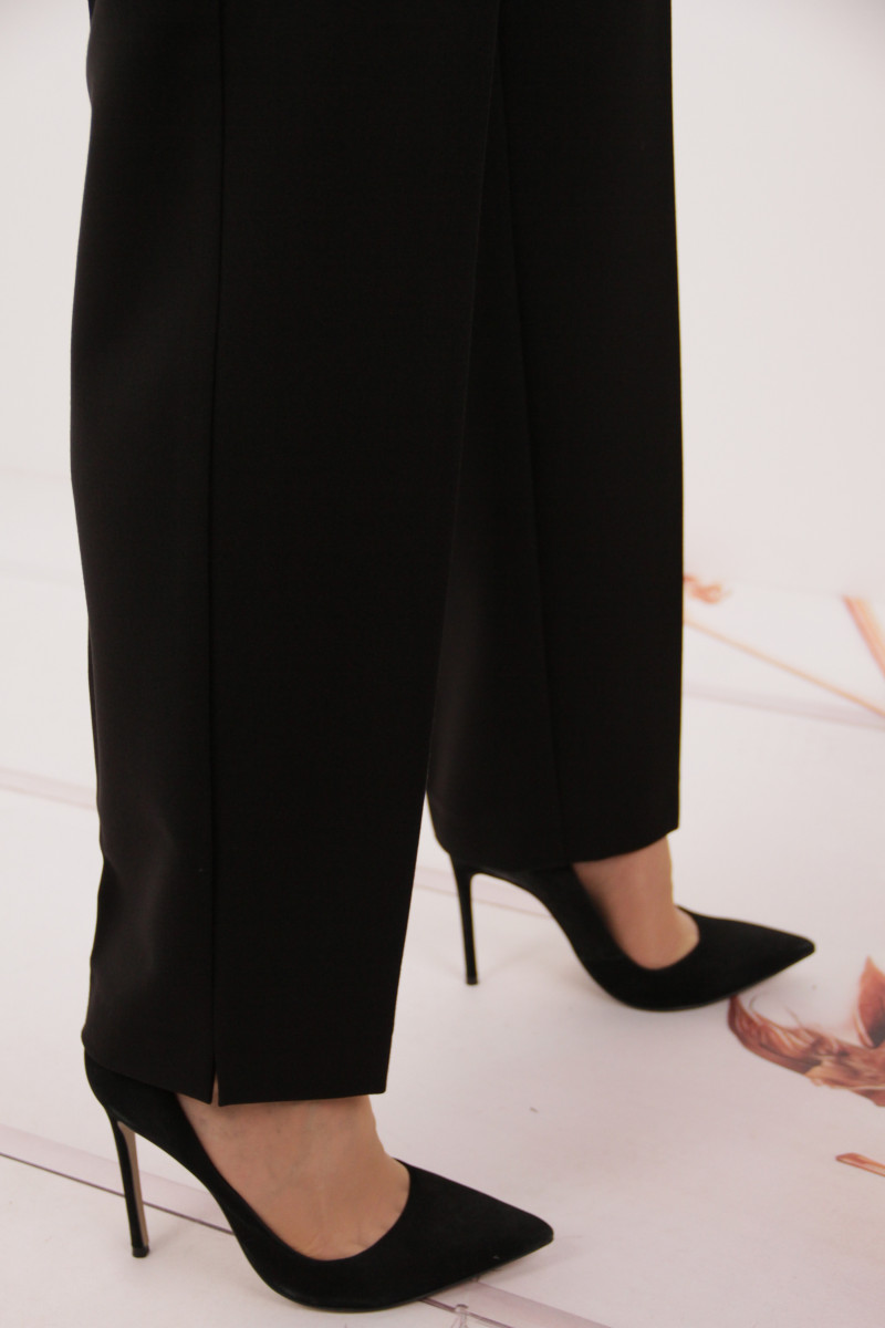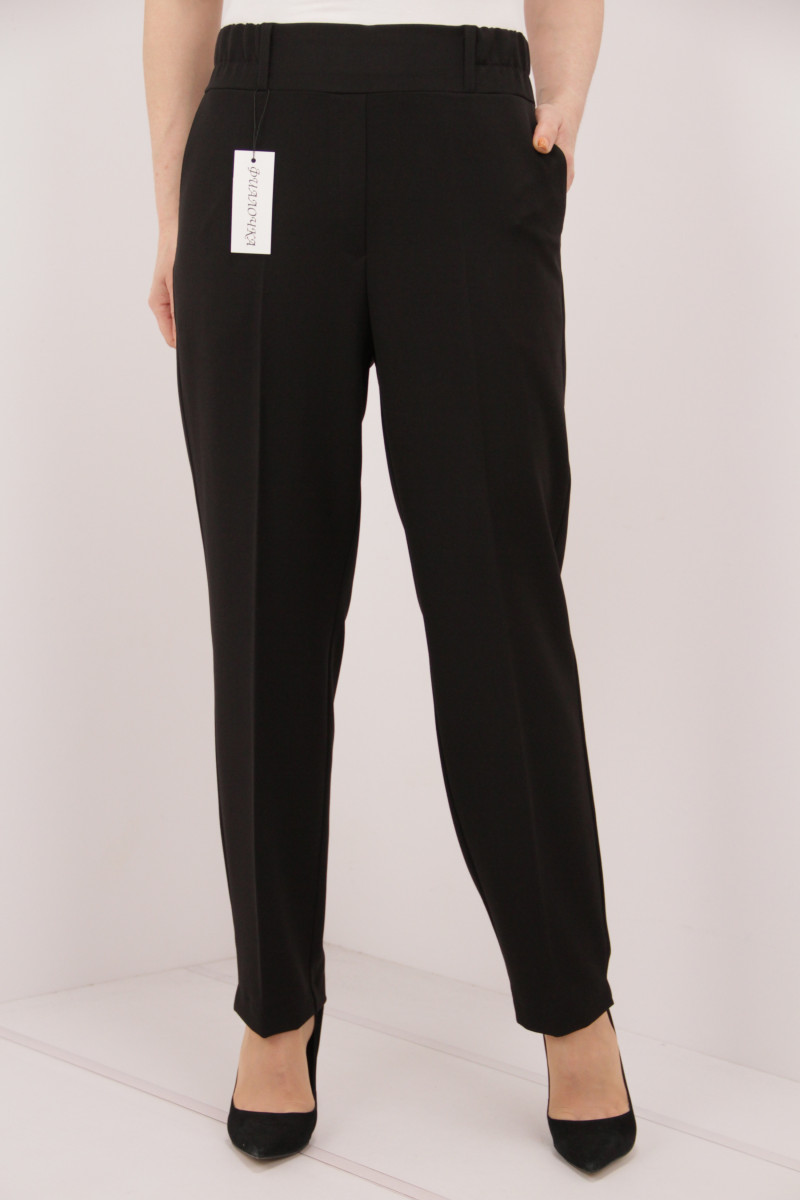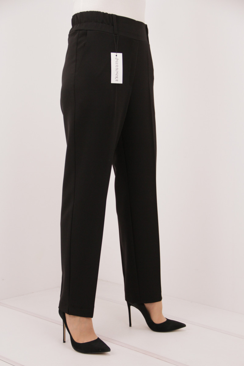 На моделі 50 розмір. Рекомендовані ростовки: 48-54, 52-58 розміри ( 4 од.) та  50-58 розміри ( 5 од.). Розміри українські. Cклад: 45% Полівіскоза, 36% Бавовна, 14% Спандекс, 5% Лайкра. Тканина: Вероніка (костюмка). Колір: чорний.